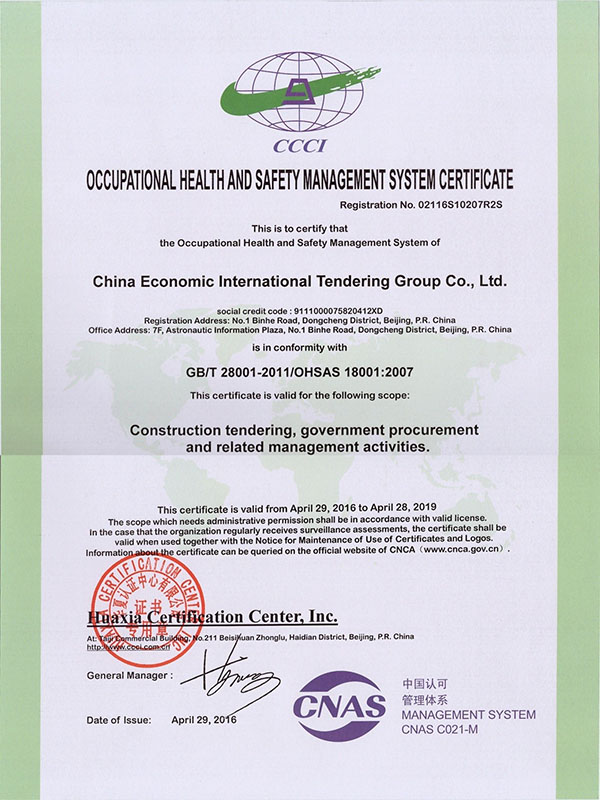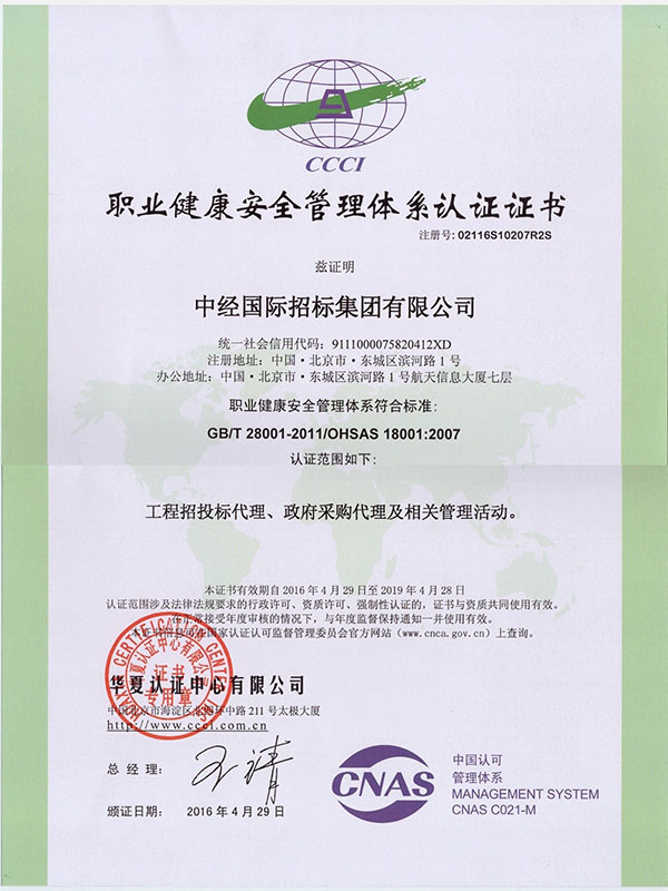 )启用新版认证证书,职业健康安全管理体系认证证书(证书编号: